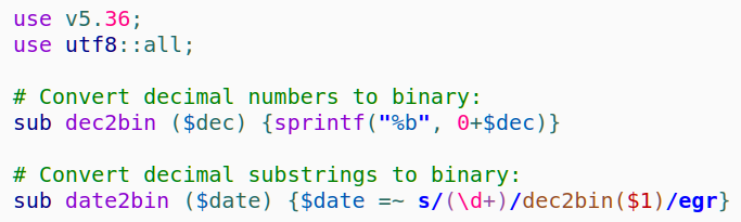 To solve this, I'll make two subroutines: "dec2bin" which converts positive integers expressed as strings of decimal digits into strings of binary digits, and "date2bin" which changes all clusters of digits in a string to their binary equivalents by calling "dec2bin" in "s/(\d+)/dec2bin($1)/egr".