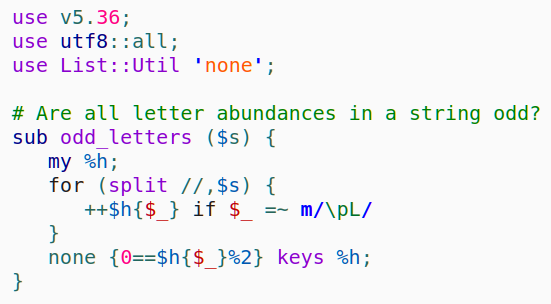 I'll use a hash to keep track of the number of times each letter appears, then I'll use the "none" function from CPAN module "List::Util" to determine if none of the keys of the hash have even values.