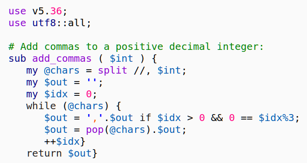 ~~~~~~~~~~~~~~~~~~~~~~~~~~~~~~~~~~~~~~~~~~~~~~~~~~~~~~~~~~~~~~~~~ Task 355-1: Thousand Separator Submitted by: Mohammad Sajid Anwar You are given a positive integer, $int. Write a script to add thousand separator, "," and return as string. Example #1: Input: $int = 123 Output: "123" Example #2: Input: $int = 1234 Output: "1,234" Example #3: Input: $int = 1000000 Output: "1,000,000" Example #4: Input: $int = 1 Output: "1" Example #5: Input: $int = 12345 Output: "12,345"