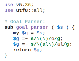 ~~~~~~~~~~~~~~~~~~~~~~~~~~~~~~~~~~~~~~~~~~~~~~~~~~~~~~~~~~~~~~~~~ Task 364-2: Goal Parser Submitted by: Mohammad Sajid Anwar You are given a string, $str. Write a script to interpret the given string using Goal Parser. The Goal Parser interprets “G” as the string “G”, “()” as the string “o”, and “(al)” as the string “al”. The interpreted strings are then concatenated in the original order. Example #1: Input: $str = "G()(al)" Output: "Goal" Example #2: Input: $str = "G()()()()(al)" Output: "Gooooal" Example #3: Input: $str = "(al)G(al)()()" Output: "alGaloo" Example #4: Input: $str = "()G()G" Output: "oGoG" Example #5: Input: $str = "(al)(al)G()()" Output: "alalGoo"